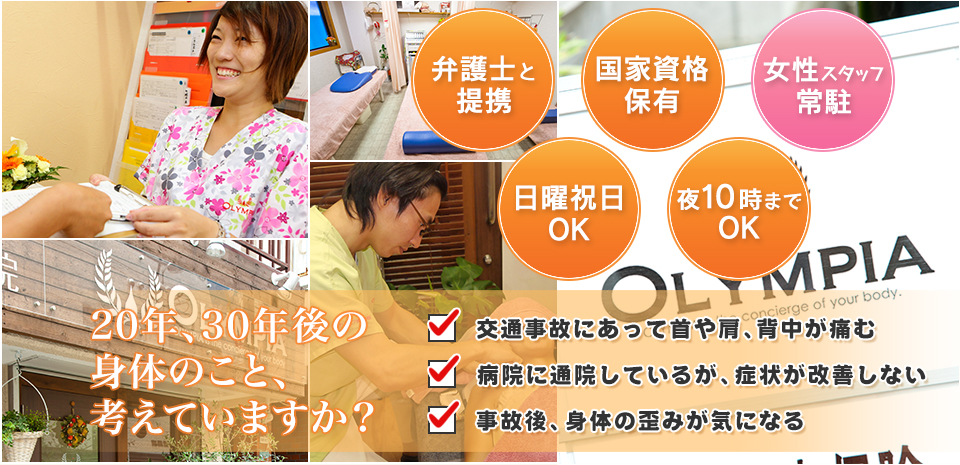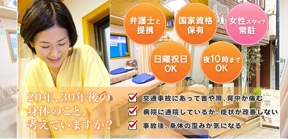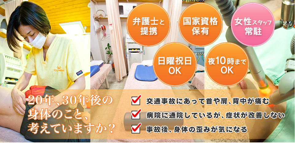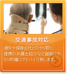 当院は、国家資格を持った交通事故治療対応のプロフェッショナルです。交通事故での過失等細かい所まで、来院していただいた方が納得されるまでアドバイス出来ます。どうぞお気軽にご相談ください。