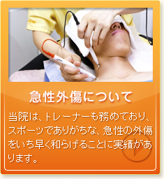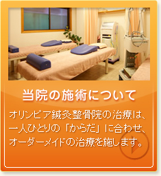 従来の整復、電器治療にあわせて矯正療法、レーザー治療、マイクロアンペア治療、テーピング等であらゆる症状への対応を志しております。